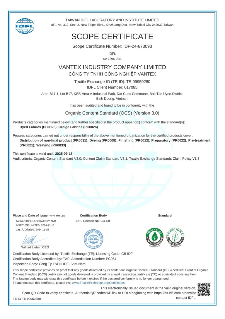 Fabric strategy aligned with factory-backed weaving, dyeing / printing and finishing in Vietnam & China.